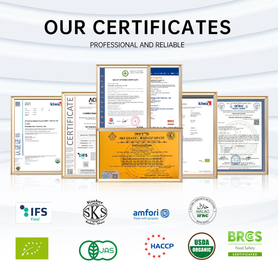 Certificación:BRC, IFS, HACCP, BSCI, KOSHER, HALAL, ORGÁNICO UE, USDA, JAS