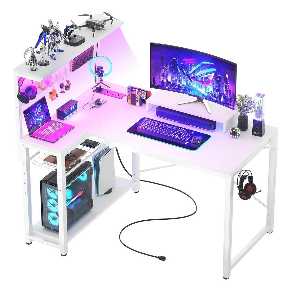 Venta al por mayor LED Pc Gaming Studio Table Home Office Furniture Madera Led Escritorio Gamer Ordenador pequeño Escritorio de esquina con estantes