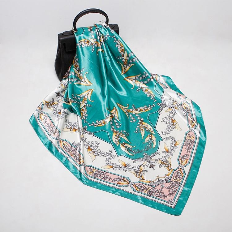 Venta al por mayor de gran stock, mezcla de diseños, tienda en línea, bufanda de satén barata, 90cm, poliéster, bufanda de satén de seda impresa