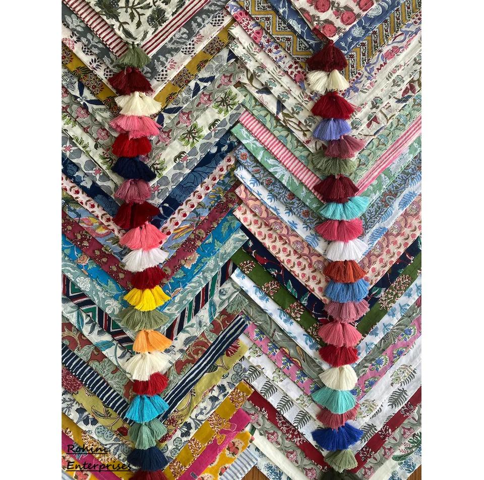 Venta al por mayor lote de servilletas de mesa reutilizables con estampado de bloques indios hechos a mano de algodón de tamaño personalizado con borlas para mezclar y combinar para bodas