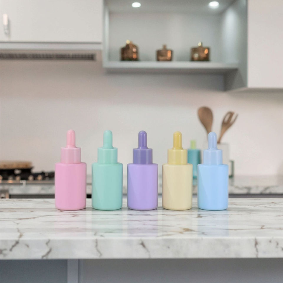 Venta al por mayor de lujo 30ML botellas de suero de vidrio mate rosa azul púrpura con tapón de rosca en caja cuentagotas de aceite esencial vacío
