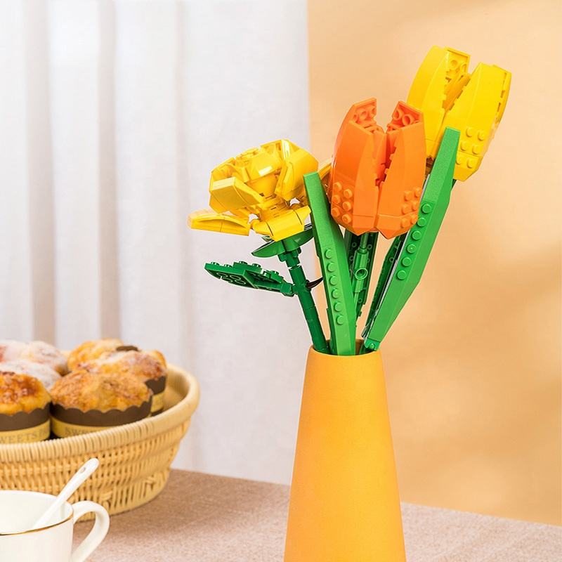 Bloques de construcción de plástico para niños, juego de bloques de flores de tulipán y girasol, venta al por mayor