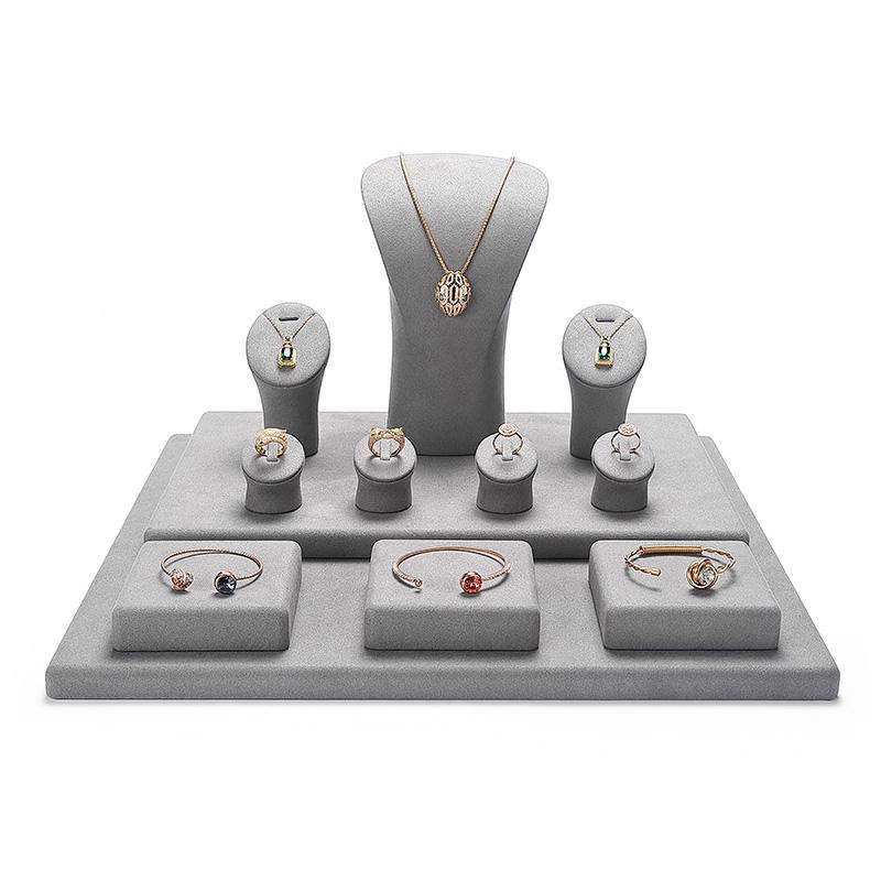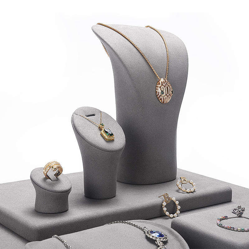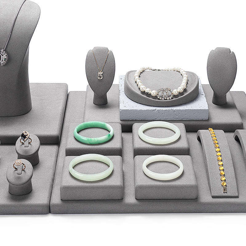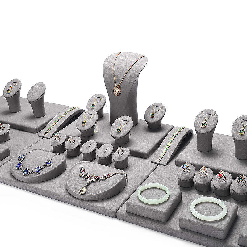Expositor de microfibra gris al por mayor, personalizable, para pulseras, collares, anillos y pendientes, juego de expositores de joyería.