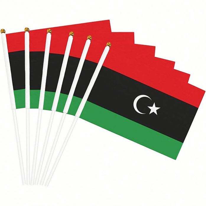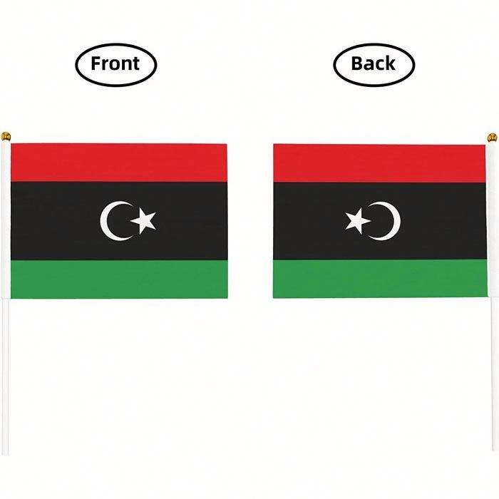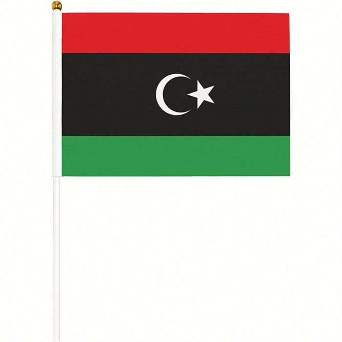 Bandera de Libia Tejida a Mano de Poliéster, Tamaño Mini, 5.5x8.2 Pulgadas, para Decoración, con Asta de PVC, Venta al Por Mayor