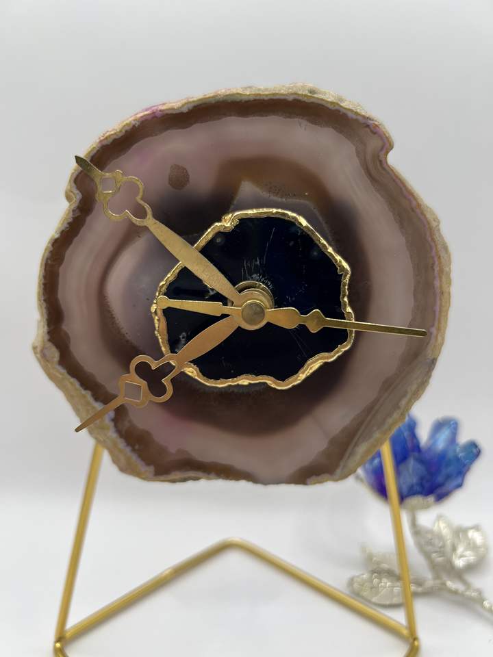 Venta al por mayor de ágata natural rebanada reloj de escritorio hecho a mano piedra de cristal reloj de mesa soporte de metal dorado geoda de lujo decoración del hogar Relojes