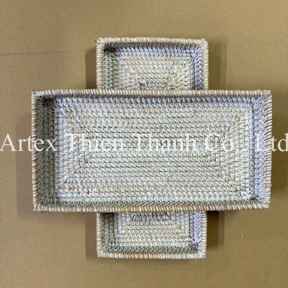 Bandeja de servicio de ratán de mimbre natural al por mayor, bandeja rectangular de adorno, accesorios de baño y aseo blanqueados