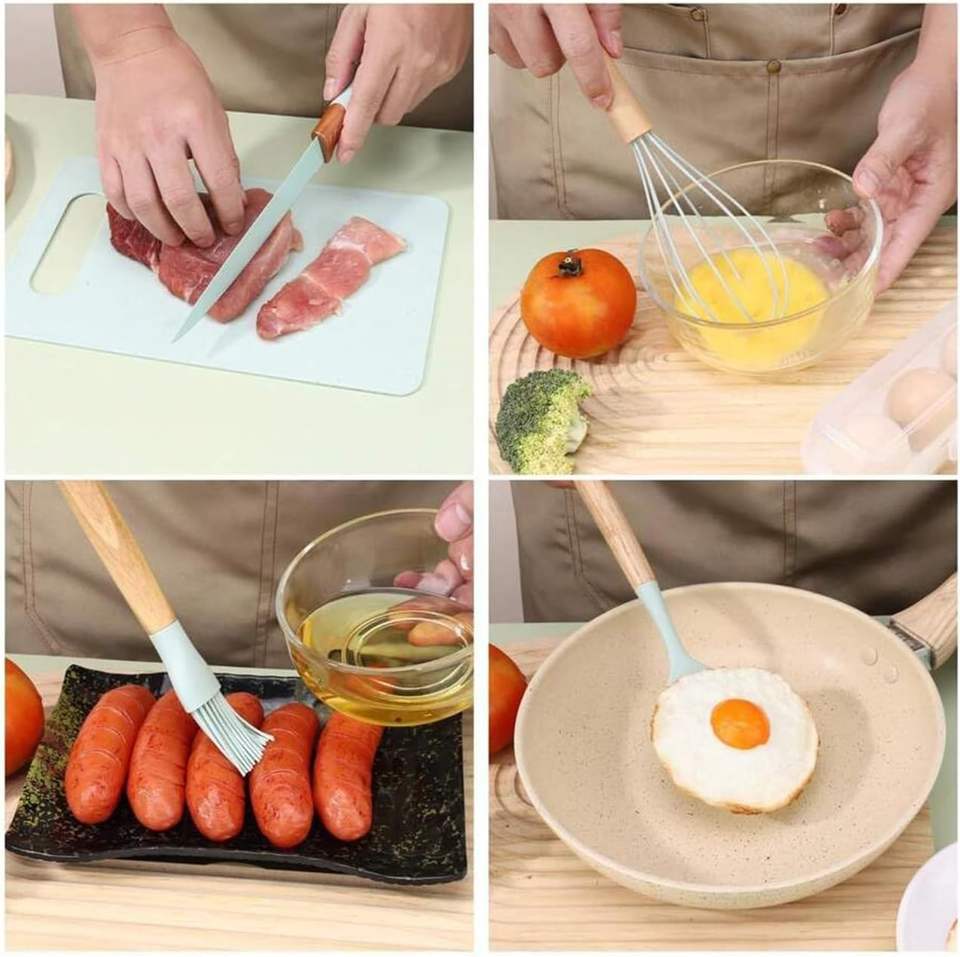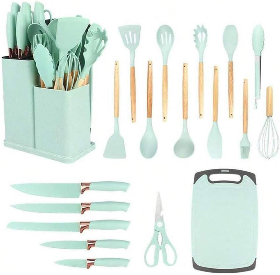 Nuevo Set de Utensilios de Cocina de Silicona de 19 Piezas al por Mayor con Tabla de Cortar, Cubo de Almacenamiento con Mango de Madera y Cuchillo Antiadherente