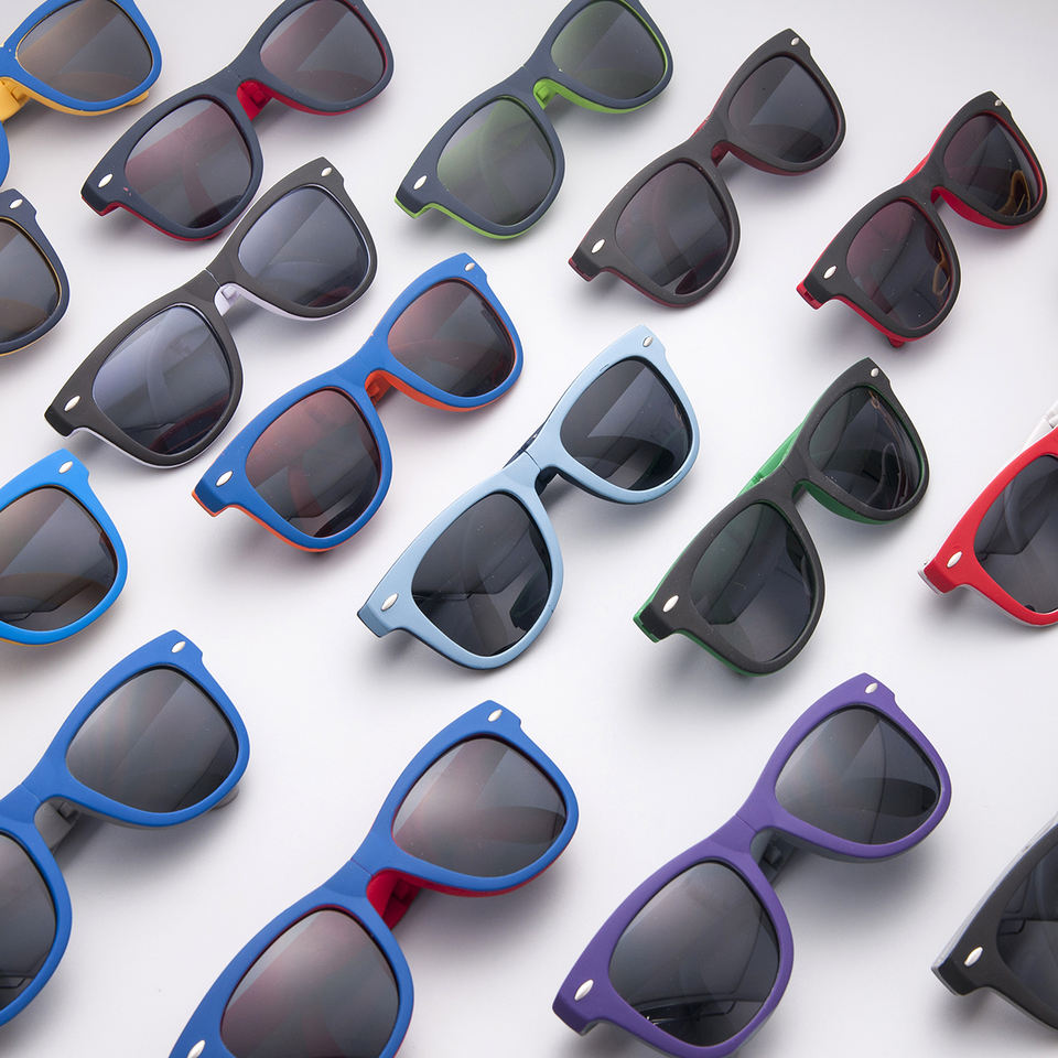 Venta al por mayor unisex compacto portátil de bolsillo plegable gafas de sol UV400 nuevo promocional de dos tonos logotipo personalizado disponible verde púrpura