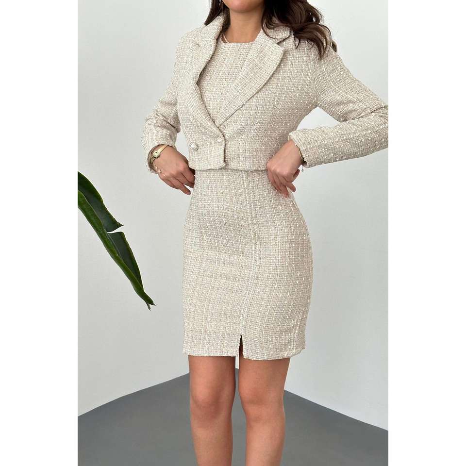 Conjunto Formal para Oficina al por Mayor, Chaqueta con Botones Beige y Vestido para Verano