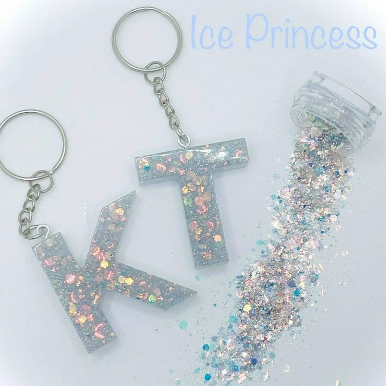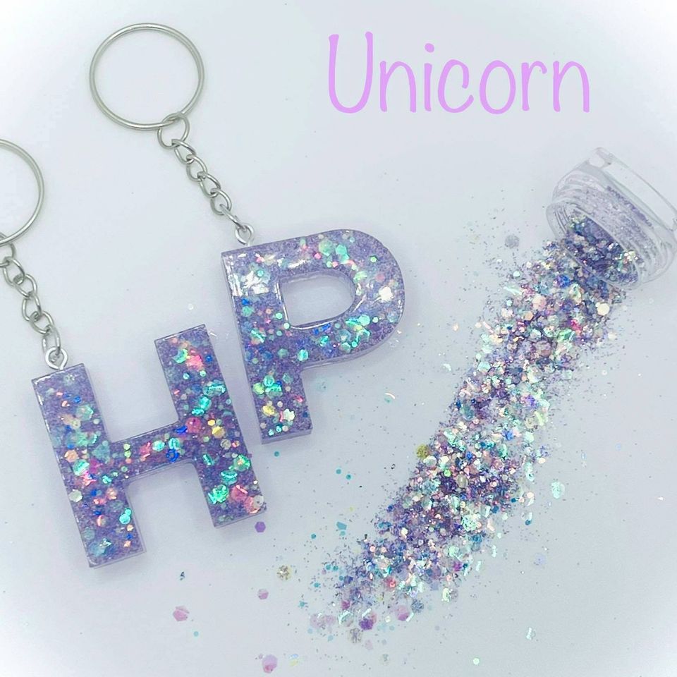 Llavero personalizado de resina con letras, llavero de resina con purpurina, precio al por mayor