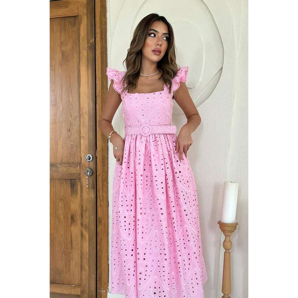 Vestido Largo Elegante de Encaje Rosa con Bordado, Tallas Grandes Disponibles, Personalizable con Cierre, para el Día
