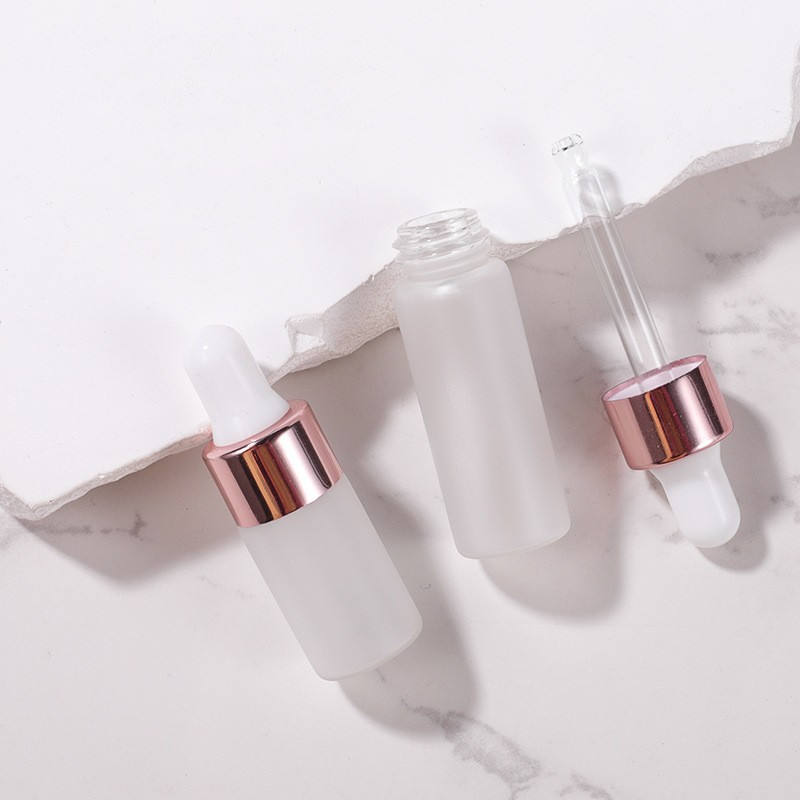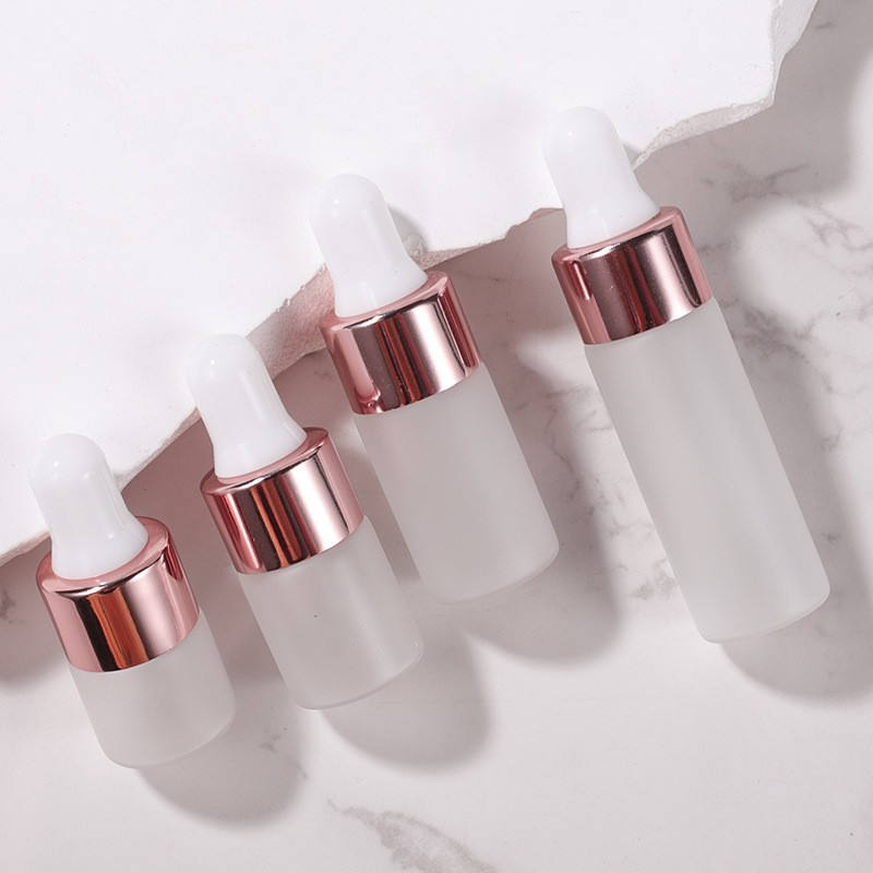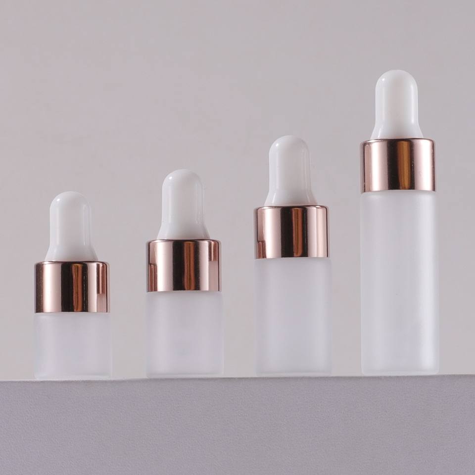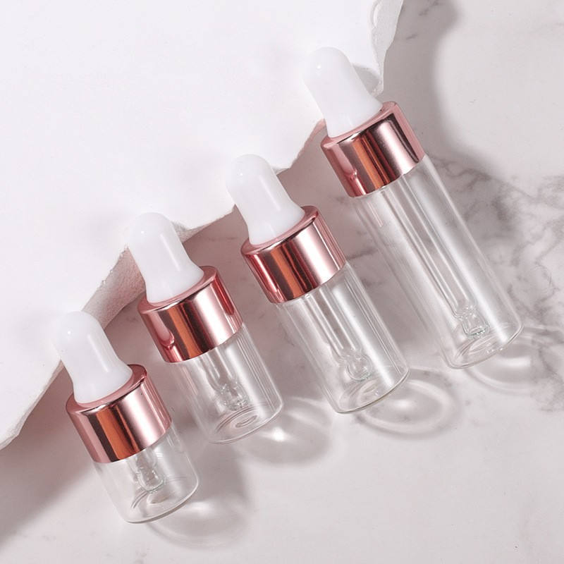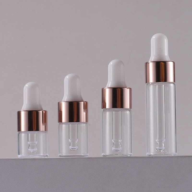 Precio al por mayor, 1ml, 2ml, 3ml, 5ml, botella cuentagotas de vidrio esmerilado transparente, botella de vidrio cuentagotas de aceite esencial vacía con tapa de oro rosa