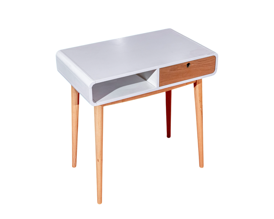 Precio al por mayor, escritorio duradero y que ahorra espacio, color natural con detalles en blanco, hecho de madera de goma, chapa de fresno MDF