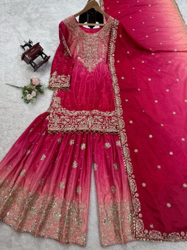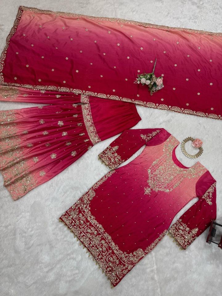 Precio al por mayor Heavy Chinon con codificación interna y secuencia con Pearl Work & Fancy Lace Front and Back Ambos lados funcionan en traje