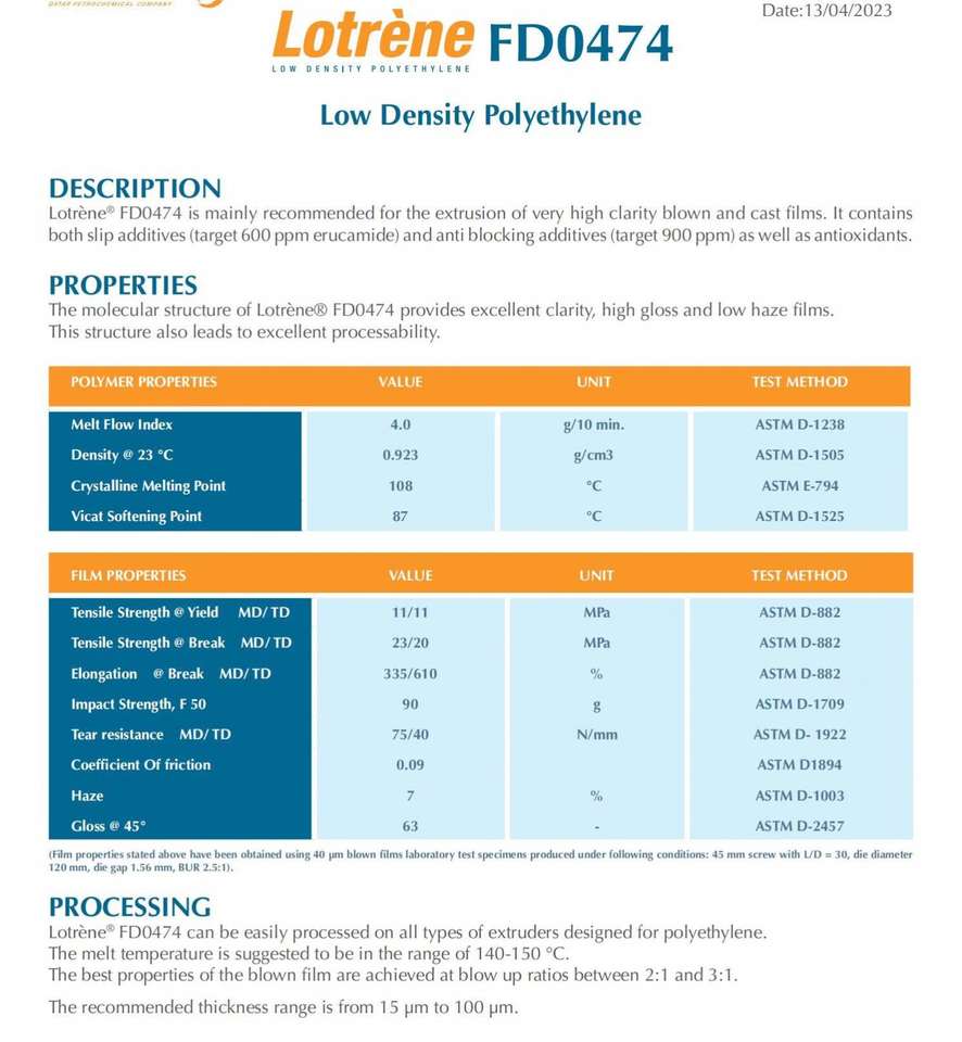 Grado alimenticio, Grado de película, Envases para cosméticos, Envases medios, Envases para alimentos, Film fundido, PelículaAplicación