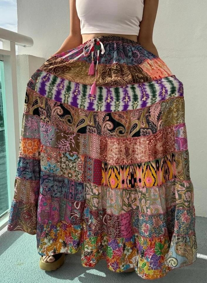 Falda Maxi de Seda con Parches Mixtos y Bolsillos al por Mayor - Talla Única, Vestido Maxi 100% Seda para Mujer
