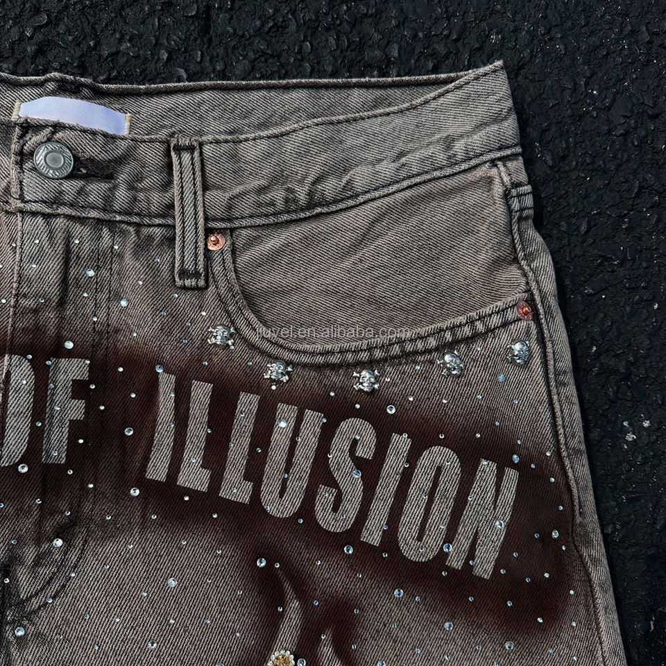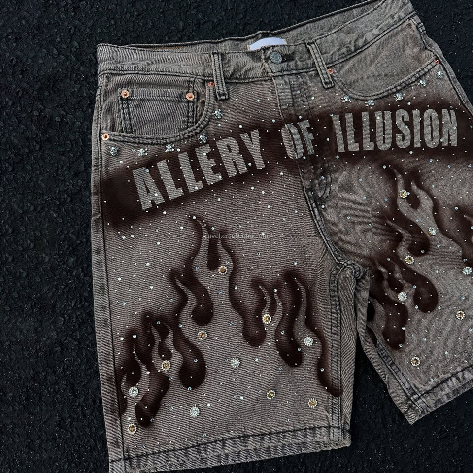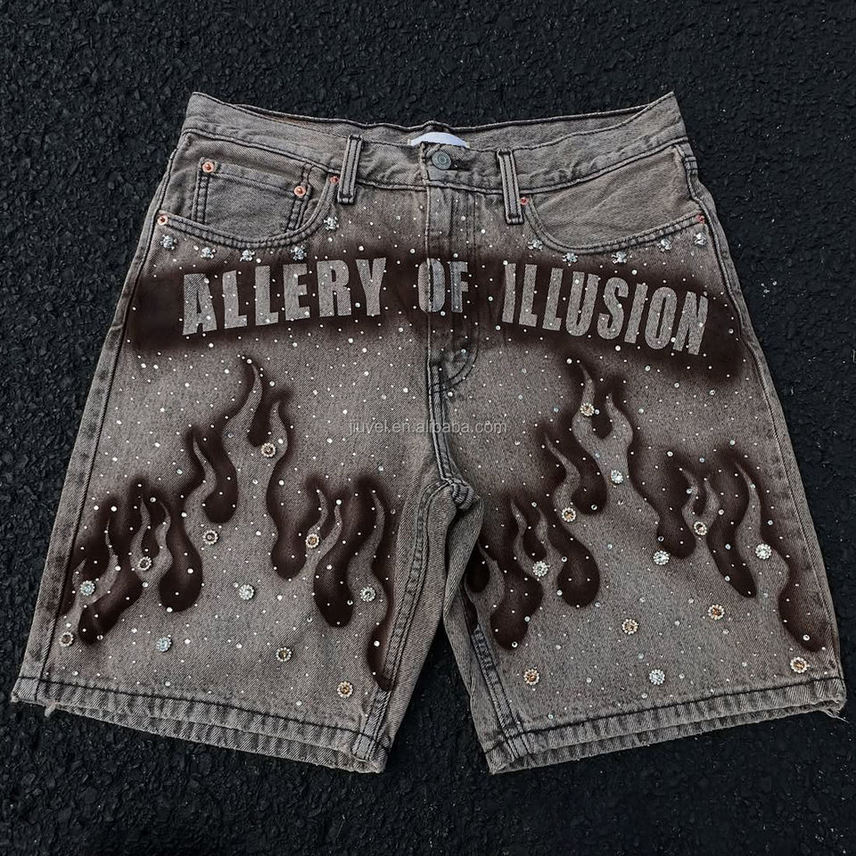 Pantalones cortos de mezclilla para hombre con estampado de serigrafía de diamantes de imitación, cierre de cremallera regular, estilo holgado, ropa urbana para hombre al por mayor