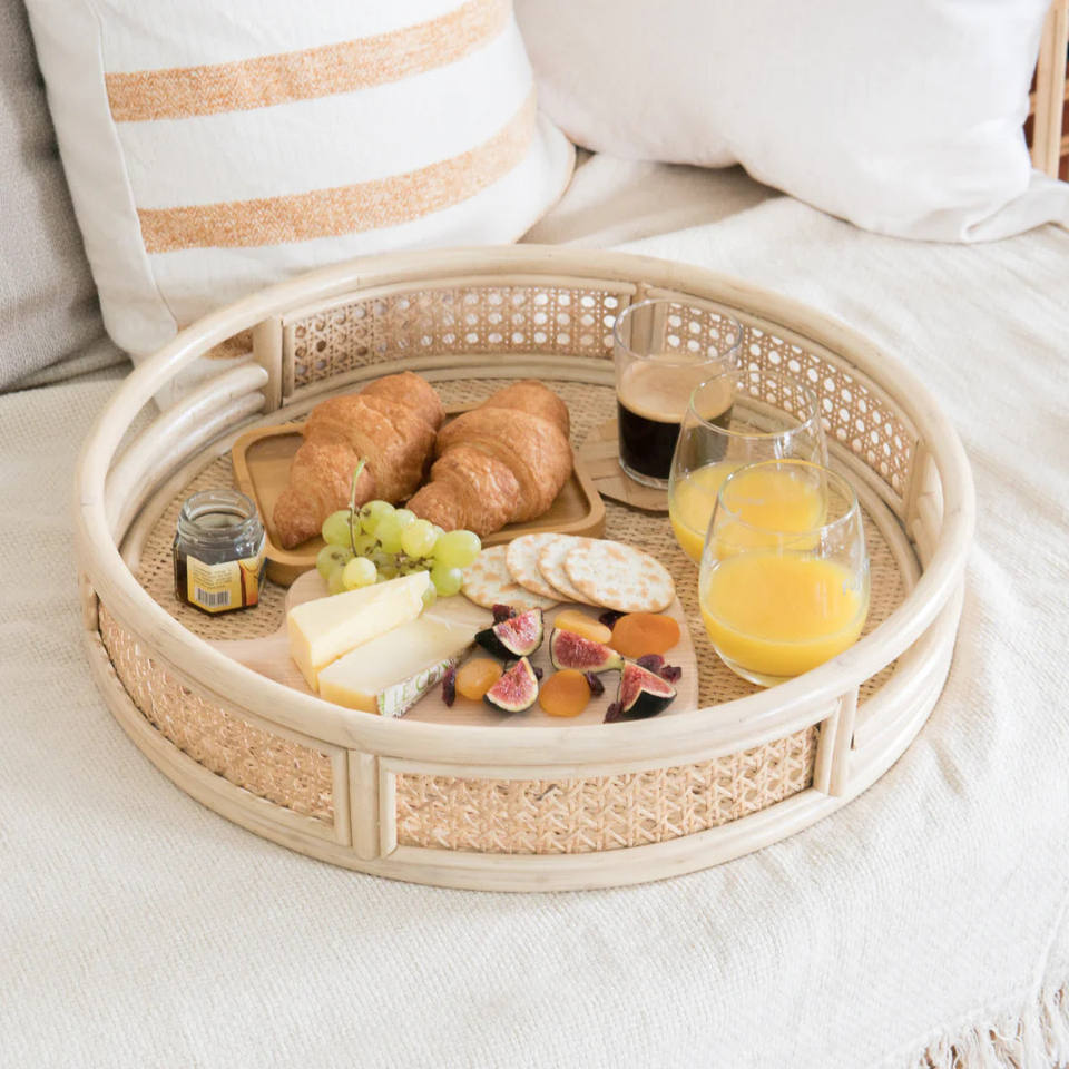 Venta al por mayor bandeja redonda de ratán natural con patrón de celosía y mango para almacenar utensilios de cocina o decoraciones para el hogar