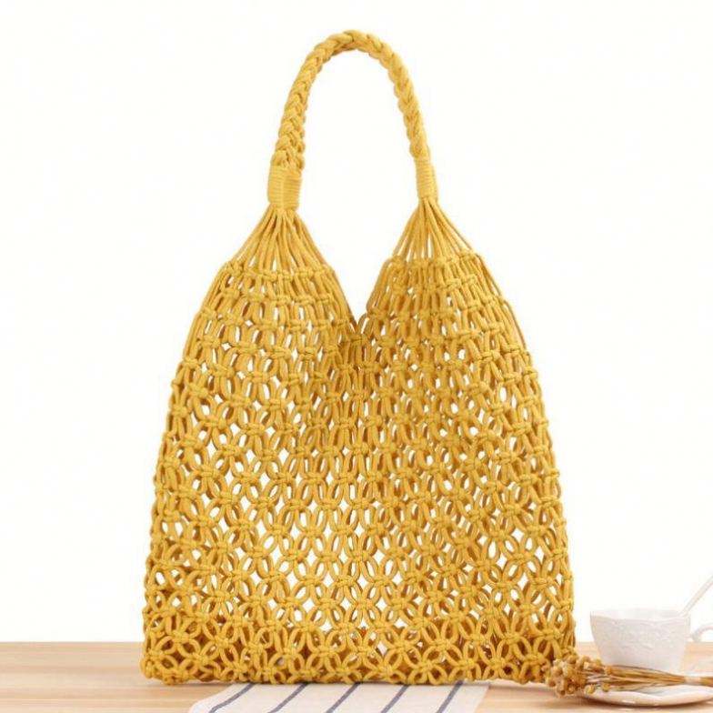 Bolso de Hombro de Color Sólido para Vacaciones en la Playa, Tejido a Mano con Cuerda de Algodón, con Bolsillo de Malla, para Mujer, con GPS, USB y Panel Solar Portátil