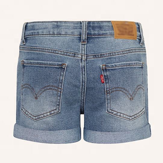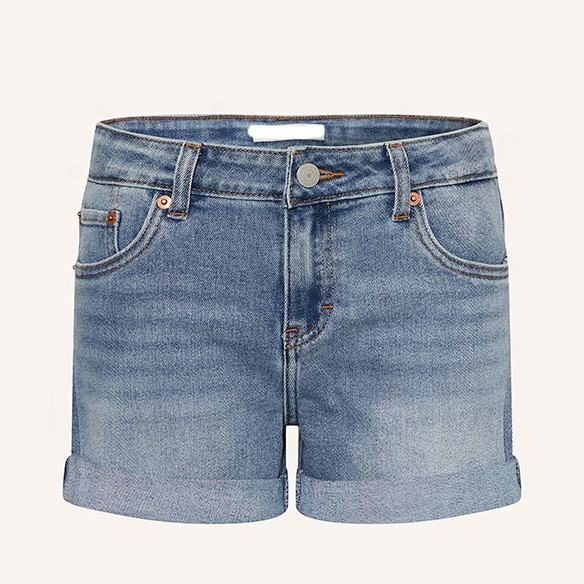 Venta al por mayor de vaqueros cortos de color sólido con cremallera y bolsillo azul claro pantalones cortos de mezclilla para niñas