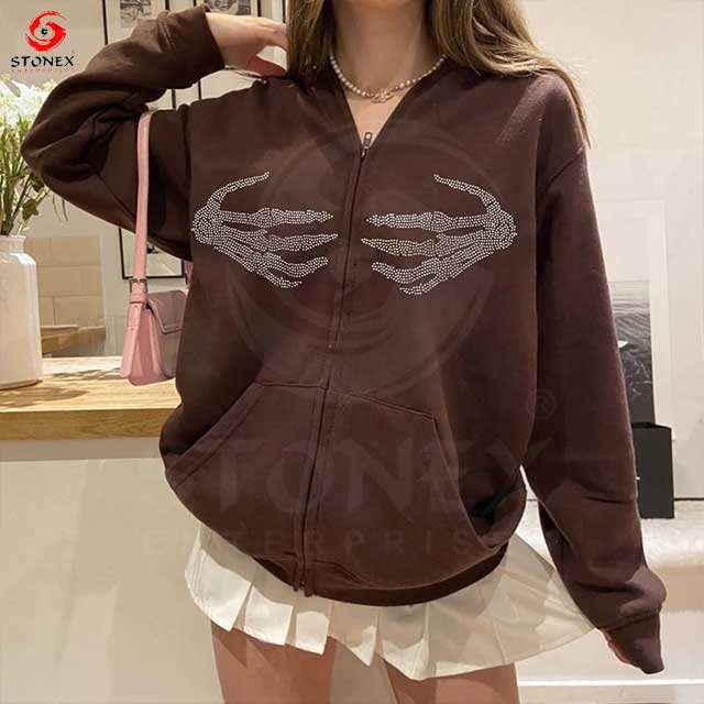 Venta al por mayor Skull Iron On Rhinestone Transfer Rhinestone Skeleton Transfers pullover Hoodies para hombres 2024