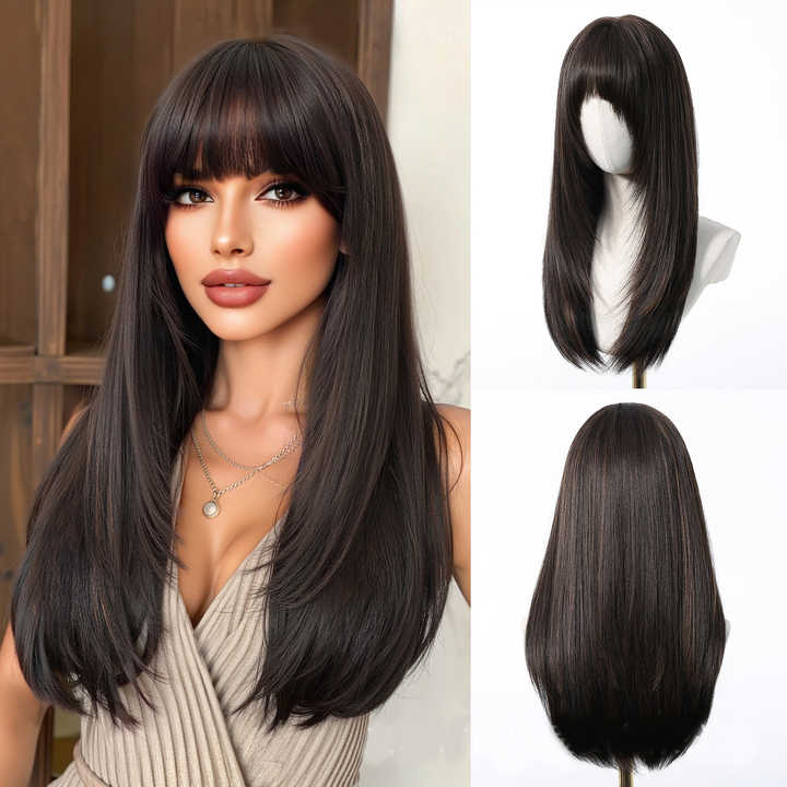 Peluca de Cabello Sintético Suave No Remy al por Mayor para Mujer, Estilo Liso Largo con Flequillo - Ecológica, Portátil, Pre-enlazada para Uso Diario y Fiestas