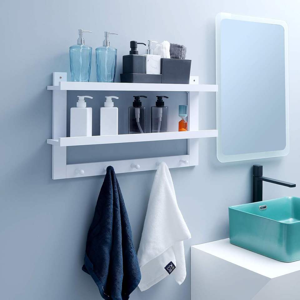 Estante de pared flotante de 2 niveles de madera maciza de Acacia al por mayor, estante de almacenamiento colgante de entrada para dormitorio, sala de estar, cocina y baño