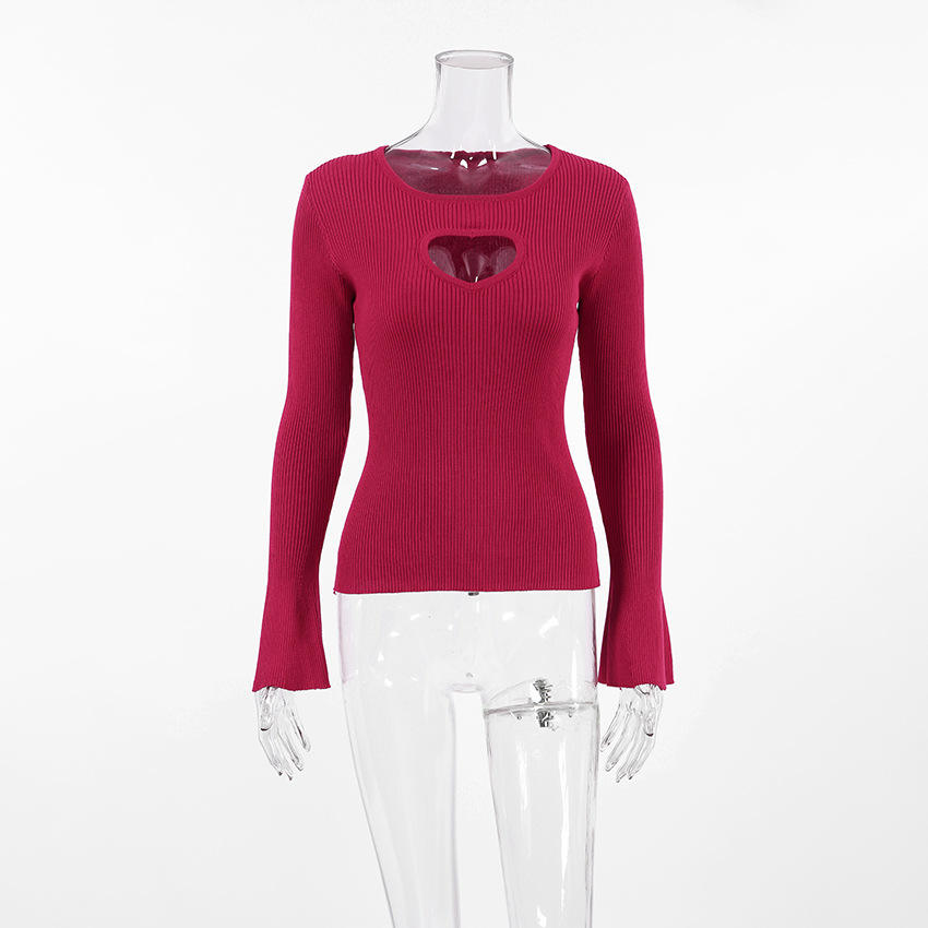 Venta al por Mayor de Tops de Punto de Manga Larga con Cuello Redondo y Abertura en el Escote, Color Sólido, para Otoño e Invierno, Moda Femenina