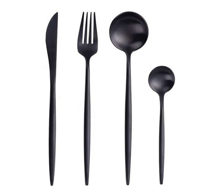 Juego de cubiertos con mango redondo sólido al por mayor, juego de cuchillos pesados de acero inoxidable, cuchara y tenedor, juego de cubiertos negros mate para bodas