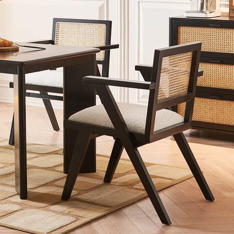Silla de Comedor de Madera Maciza con Ratán y Cojín de Bouclé para Hogar, Cafeterías y Restaurantes Costeros en Australia y Filipinas