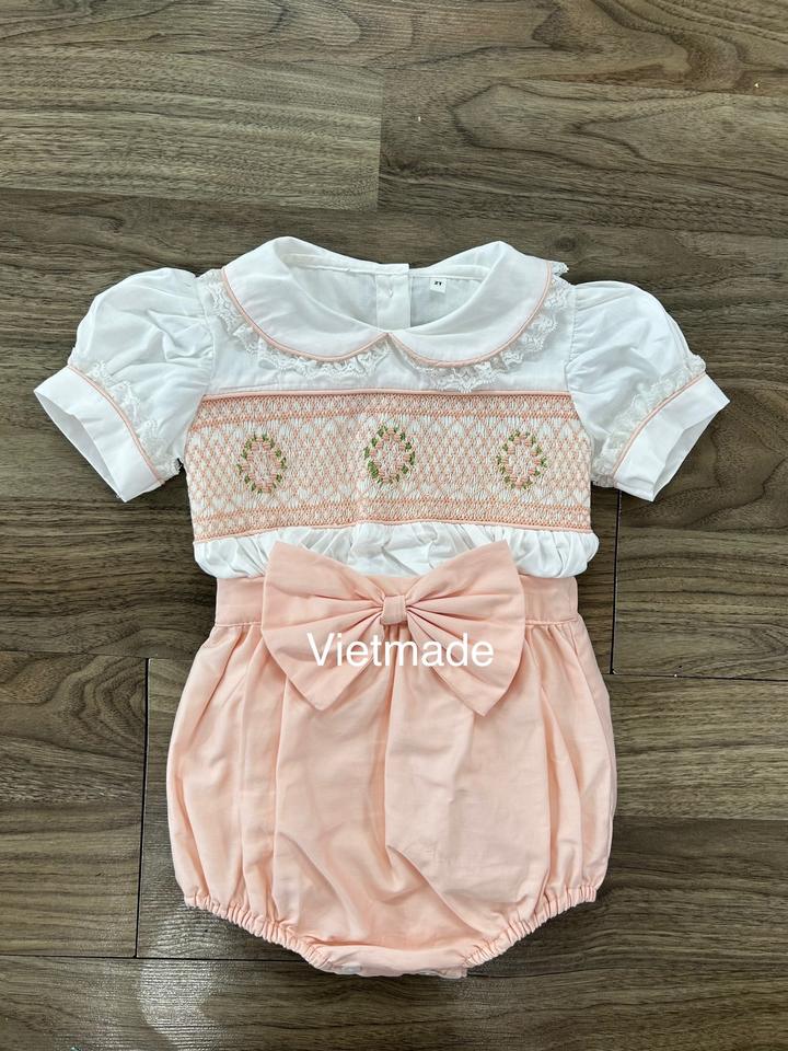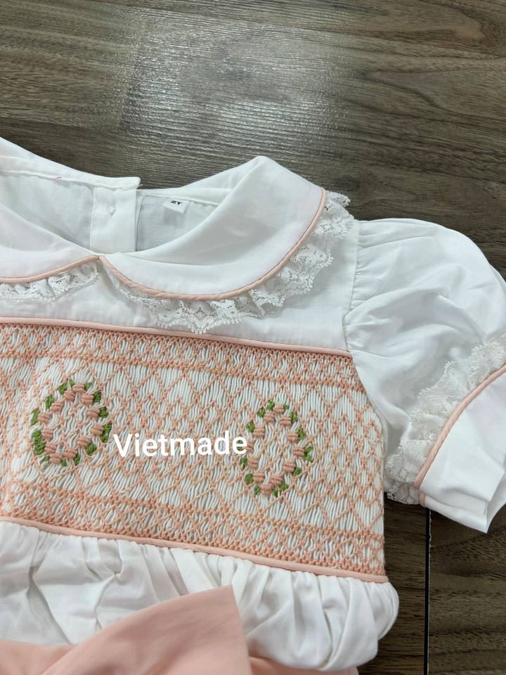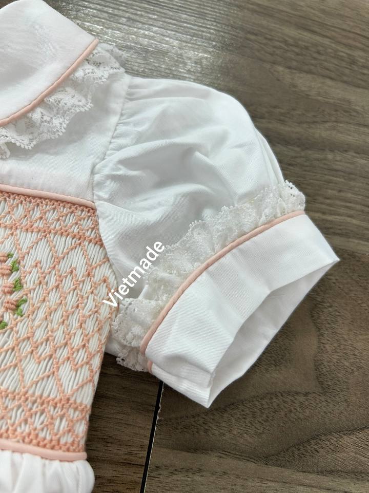 Venta al por mayor verano algodón cómodo Rosa bordado Handsmocked niñas manga corta mameluco Smocked mamelucos para niñas bebés