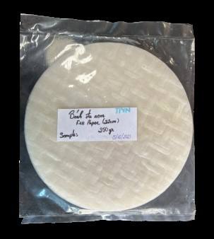 Papel de arroz fino y redondo, blanco natural, crujiente cuando se fríe.