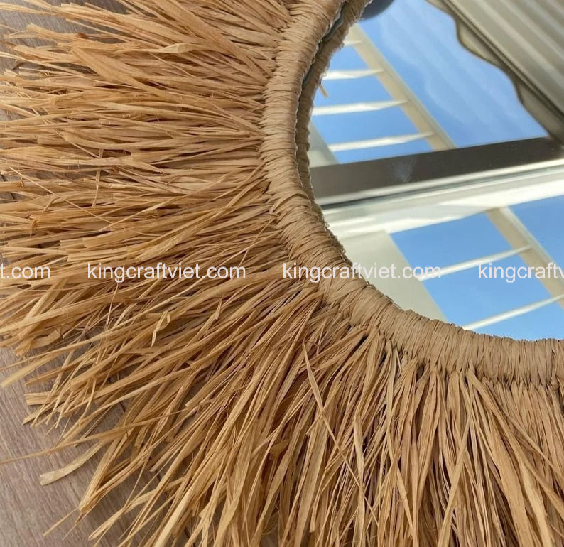 Venta al por mayor tradicional en forma de sol bohemio rafia Palma ratán paja algas marinas pared espejo decoración del hogar tamaño personalizado Vietnam