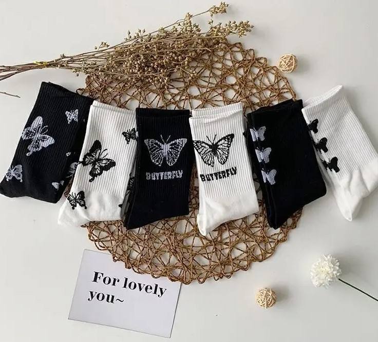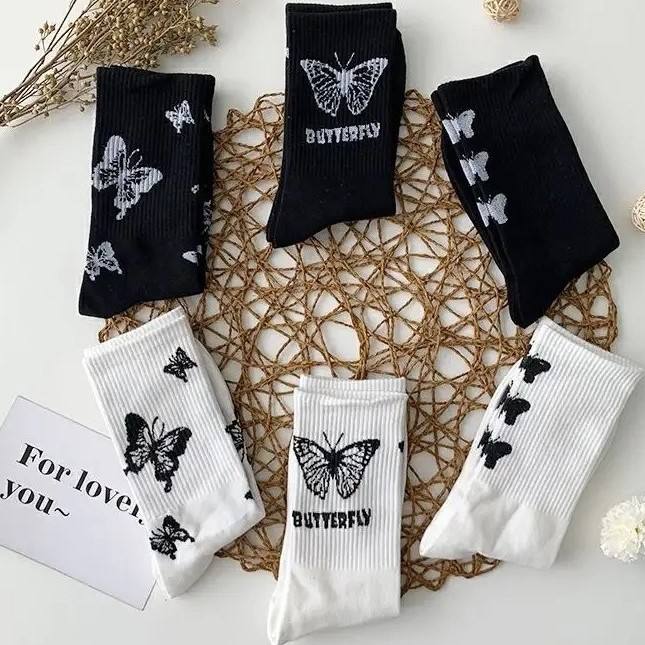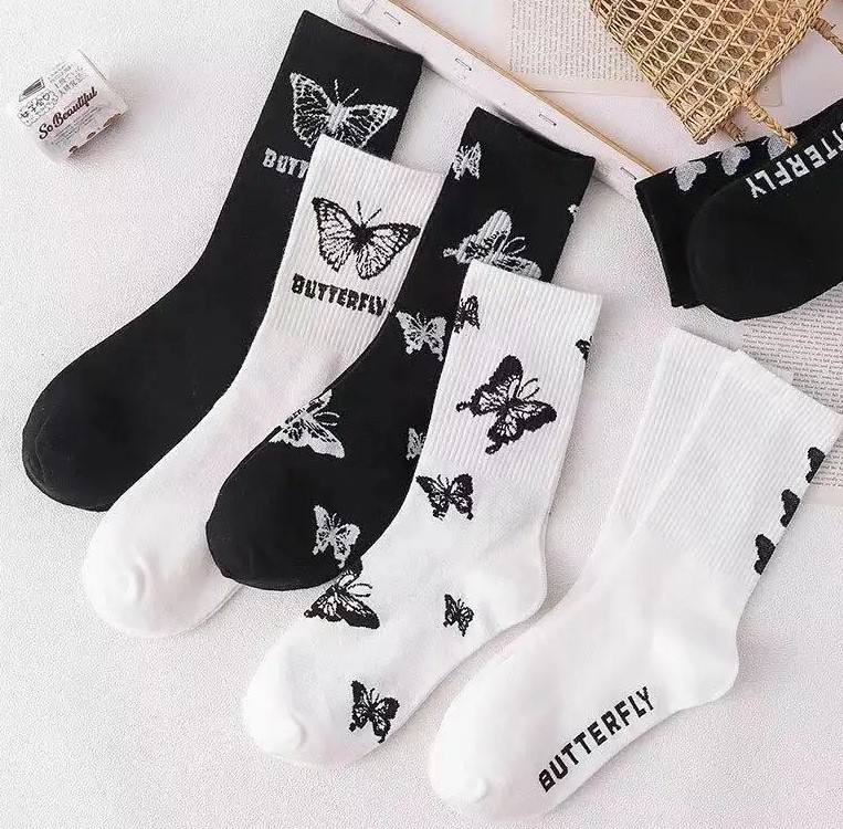 Venta al por mayor Trending Factory Made Butterfly Calcetines Patrón lindo blanco y negro con los mejores precios Crew Calcetines Mujeres Artículos de regalo