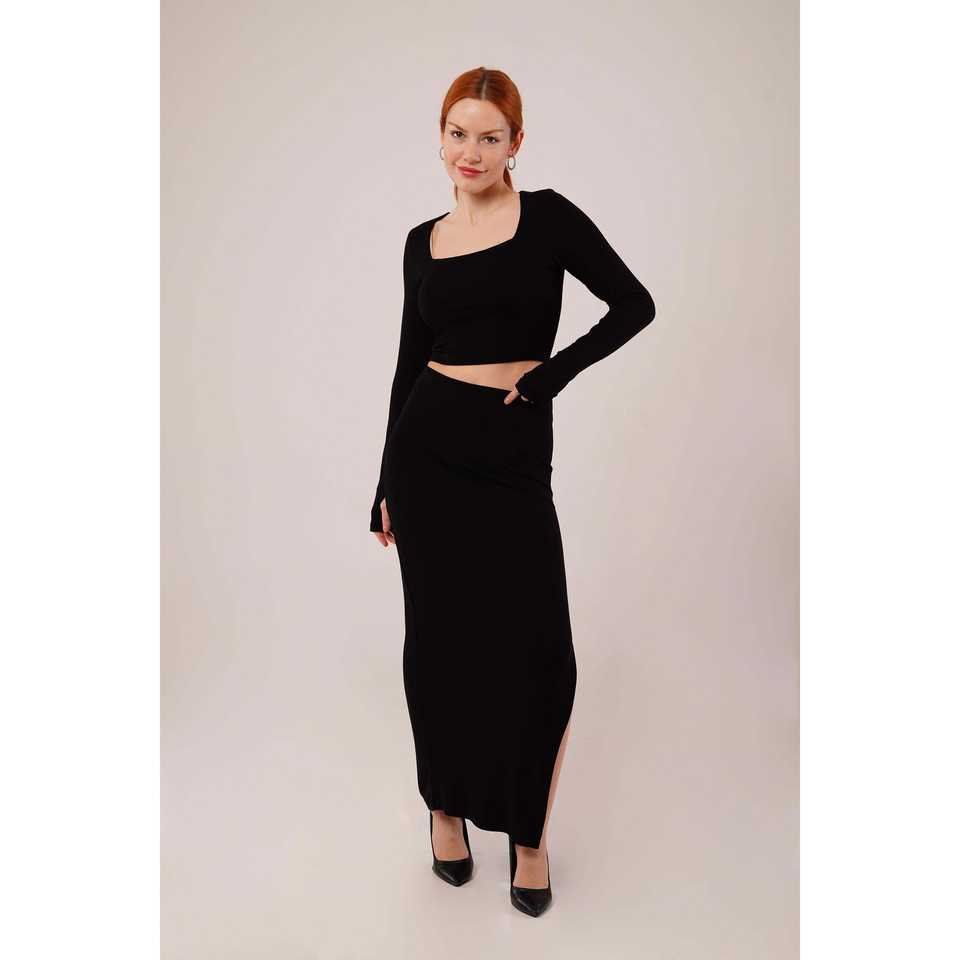 Conjunto de Dos Piezas al por Mayor, Color Negro, Estilo Casual, Blusa con Cuello Cuadrado y Falda con Abertura Lateral para Verano, Talla XL, Diseño Sólido