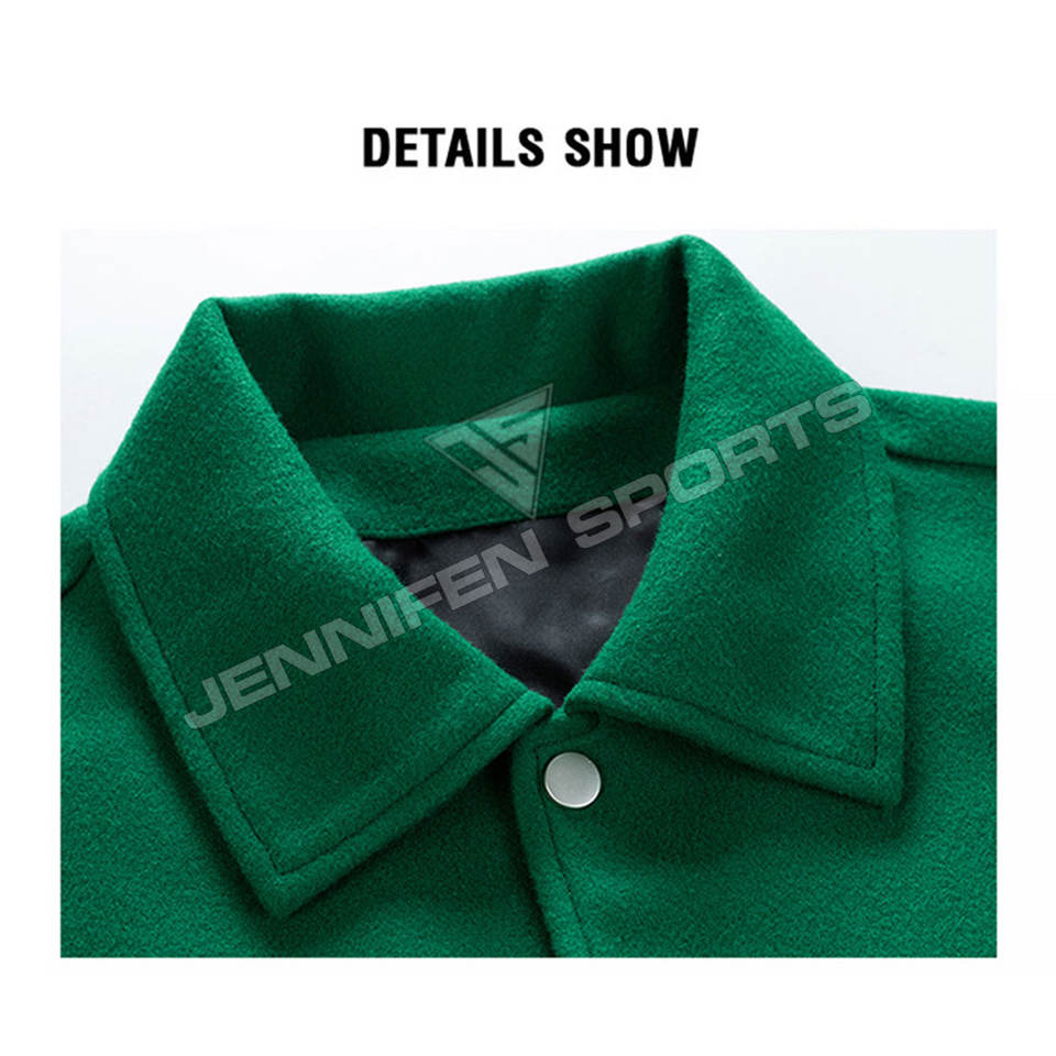Chaqueta universitaria Letterman unisex al por mayor, carcasa de tela de lana, Mangas de cuero, cierre de botón, forro interior de poliéster