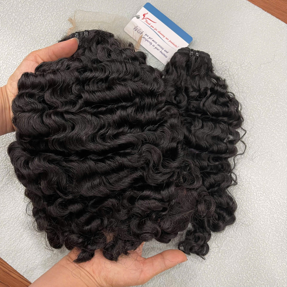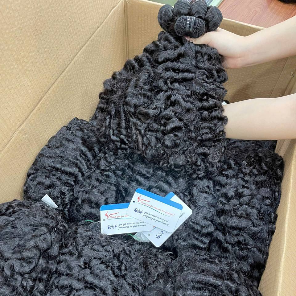 Venta al por mayor Virgen Rizado Remy Extensiones de cabello Fuzz Birmano Rizos Paquetes Máquina Trama Vietnamita Cabello Humano
