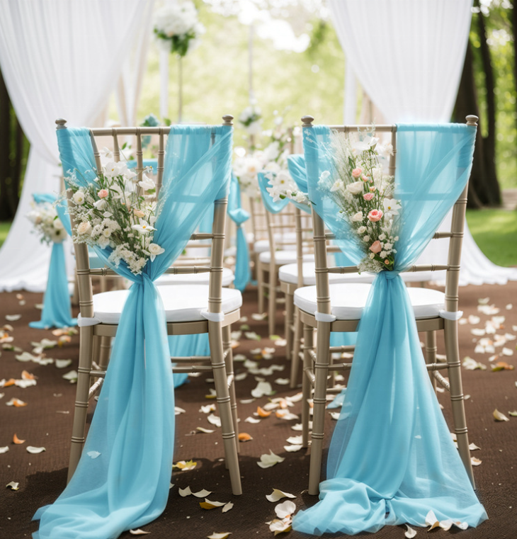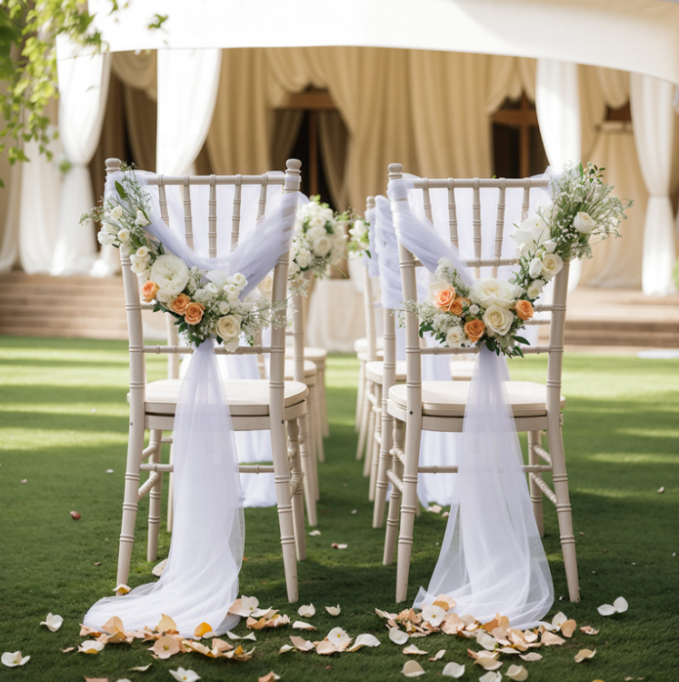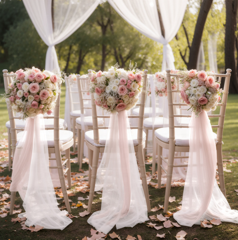 Venta al por mayor de decoraciones para sillas de pasillo de boda, accesorios de boda, silla de exterior, decoración de hilo trasero para arreglos de boda