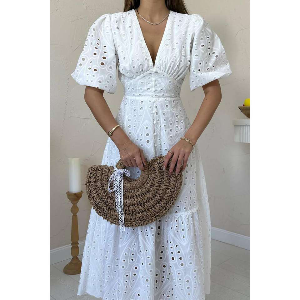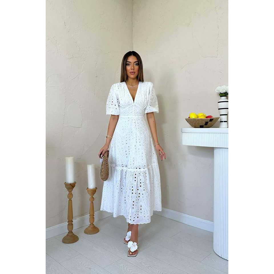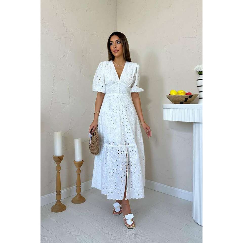 Vestido de Cóctel Blanco al por Mayor con Detalle Fruncido y Bordado de Encaje