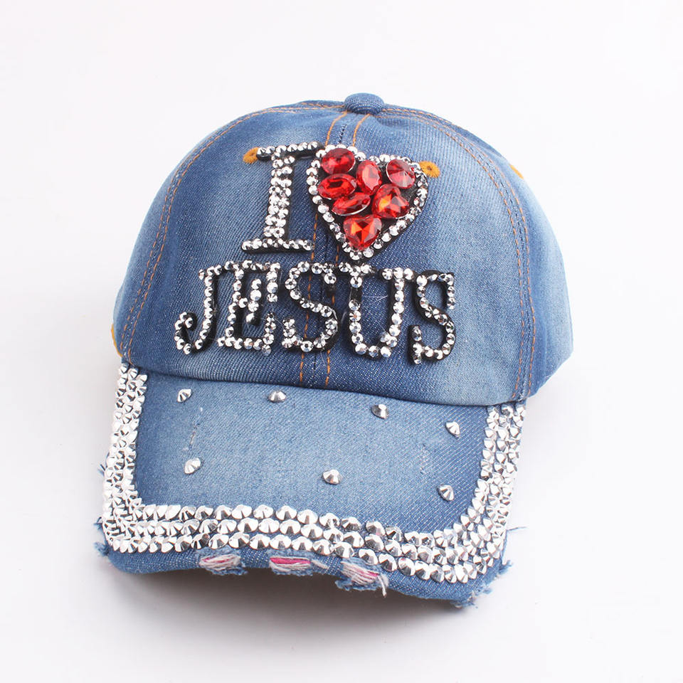 Gorras de béisbol con remaches para mujer, gorras de béisbol con remaches de diamantes de imitación con letras I LOVE JESUS