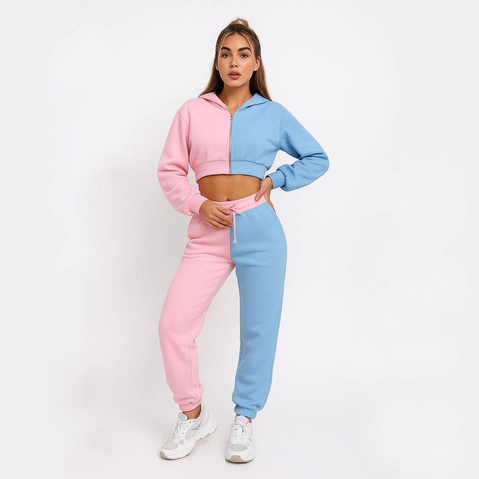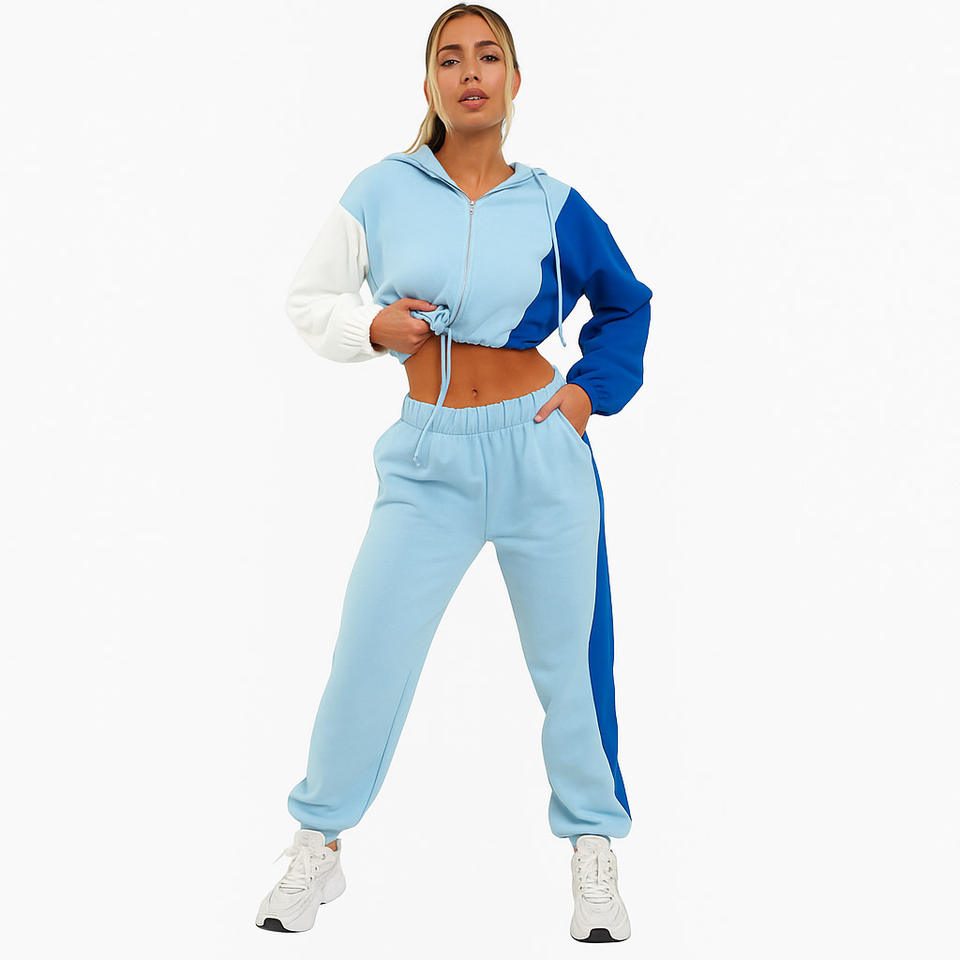 Conjunto de chándal de bloque de color para mujer al por mayor, Sudadera con capucha recortada de moda de dos piezas y pantalones para correr, ropa de salón deportiva para gimnasio
