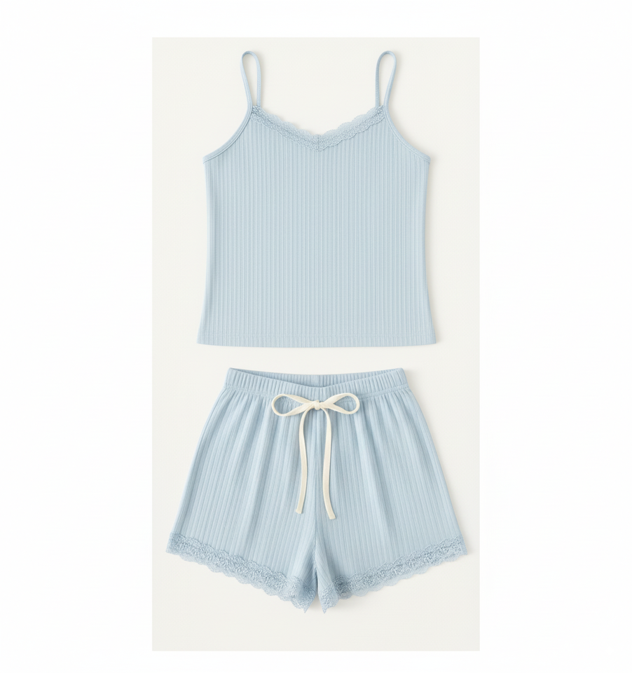 Conjunto de Pijama de Verano para Mujer al por Mayor: Camisola y Pantalones Cortos de Algodón 100% con Ribetes de Encaje, Ajuste Ceñido por Encima de la Rodilla, Cómodo para Dormir
