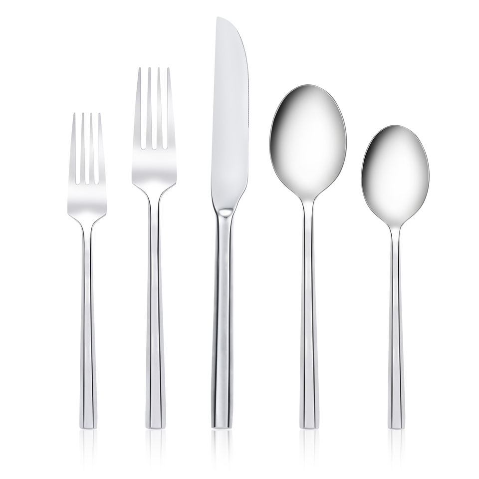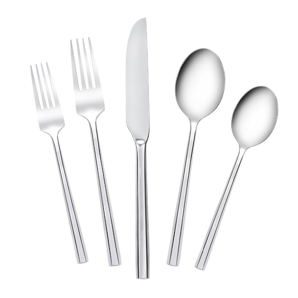 Venta al por mayor de cubiertos pesados, 5 piezas de cubiertos plateados de acero inoxidable, juego de cubiertos para restaurante para boda