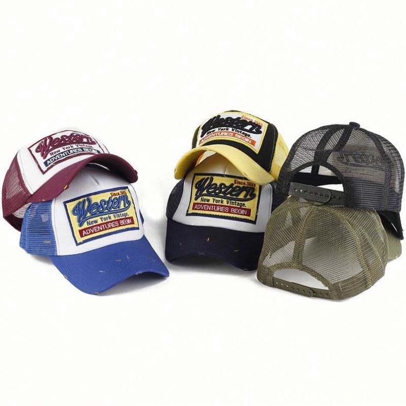 Gorra desgastada personalizada de 5 paneles, bicolor, para deportes al aire libre, estilo trucker.