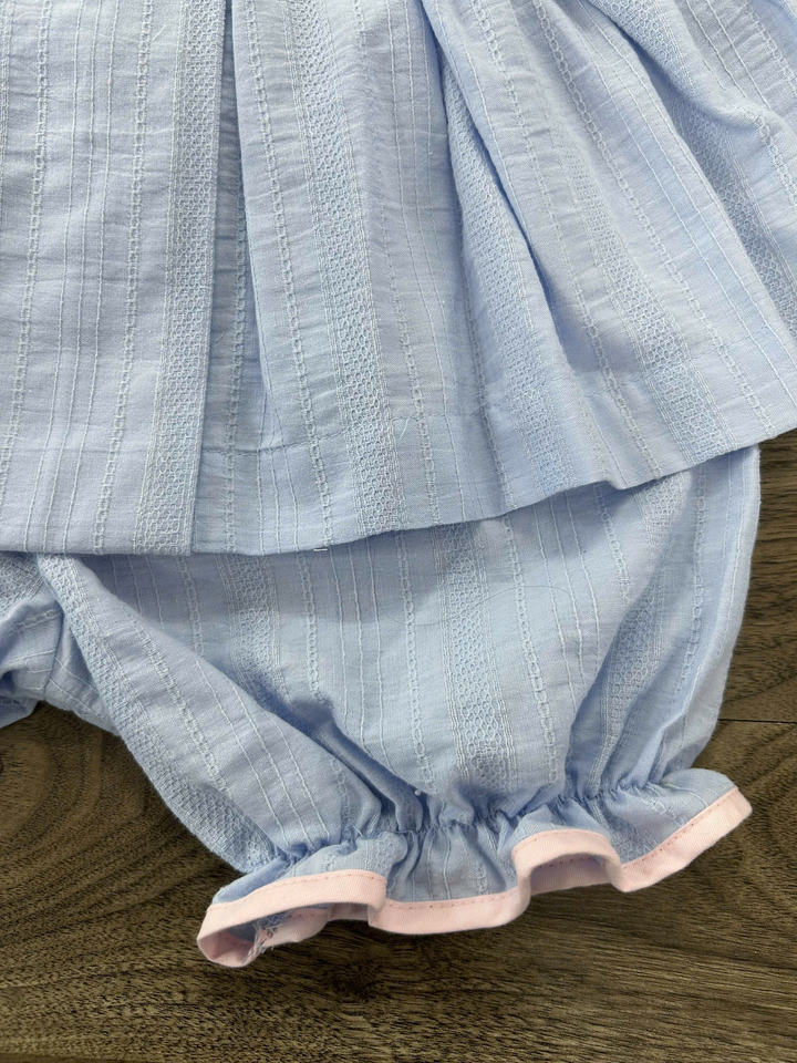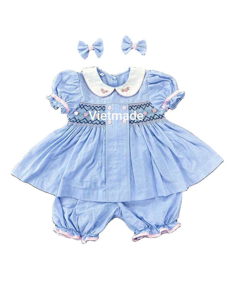 Venta al por mayor Boutique Ropa para niños Pijamas Puff Manga Niños Falda de algodón azul Bordado Bebé Niñas Smocking conjunto