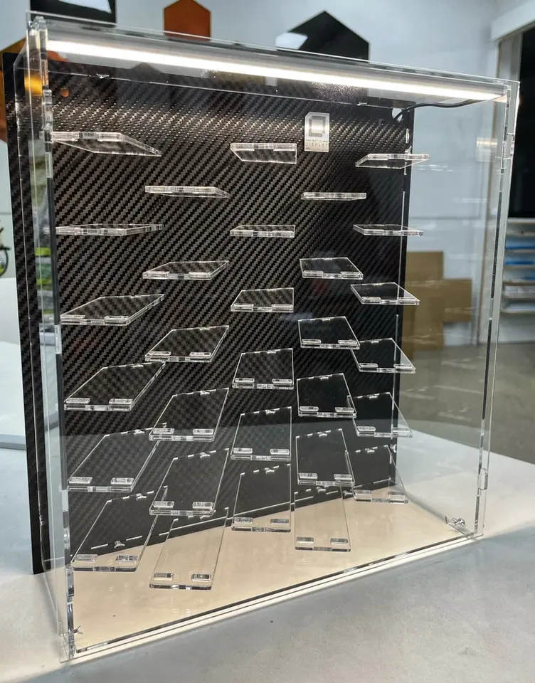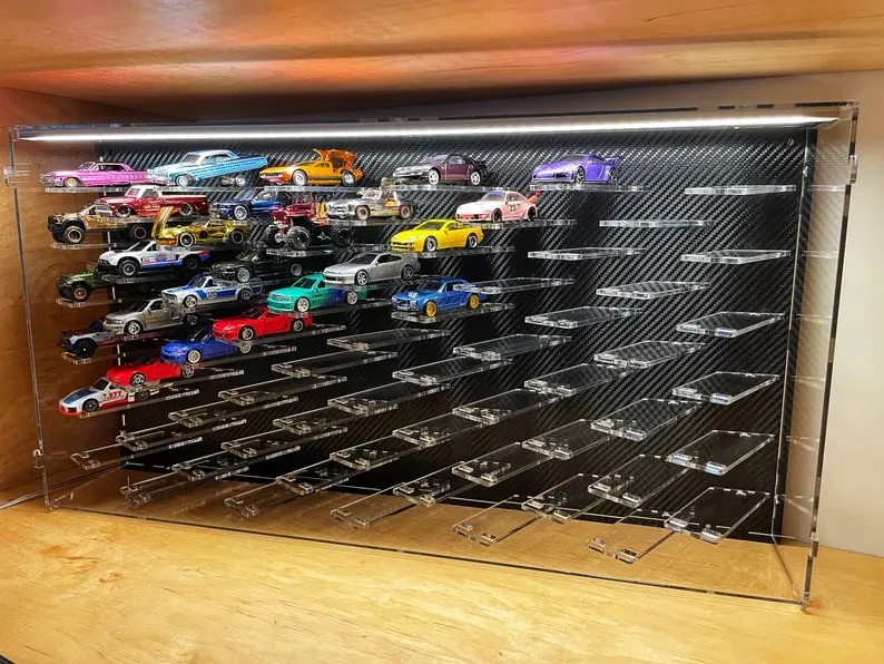 Caja expositor acrílica personalizada para coches de juguete, venta al por mayor, estilo Hot Wheels, con puerta