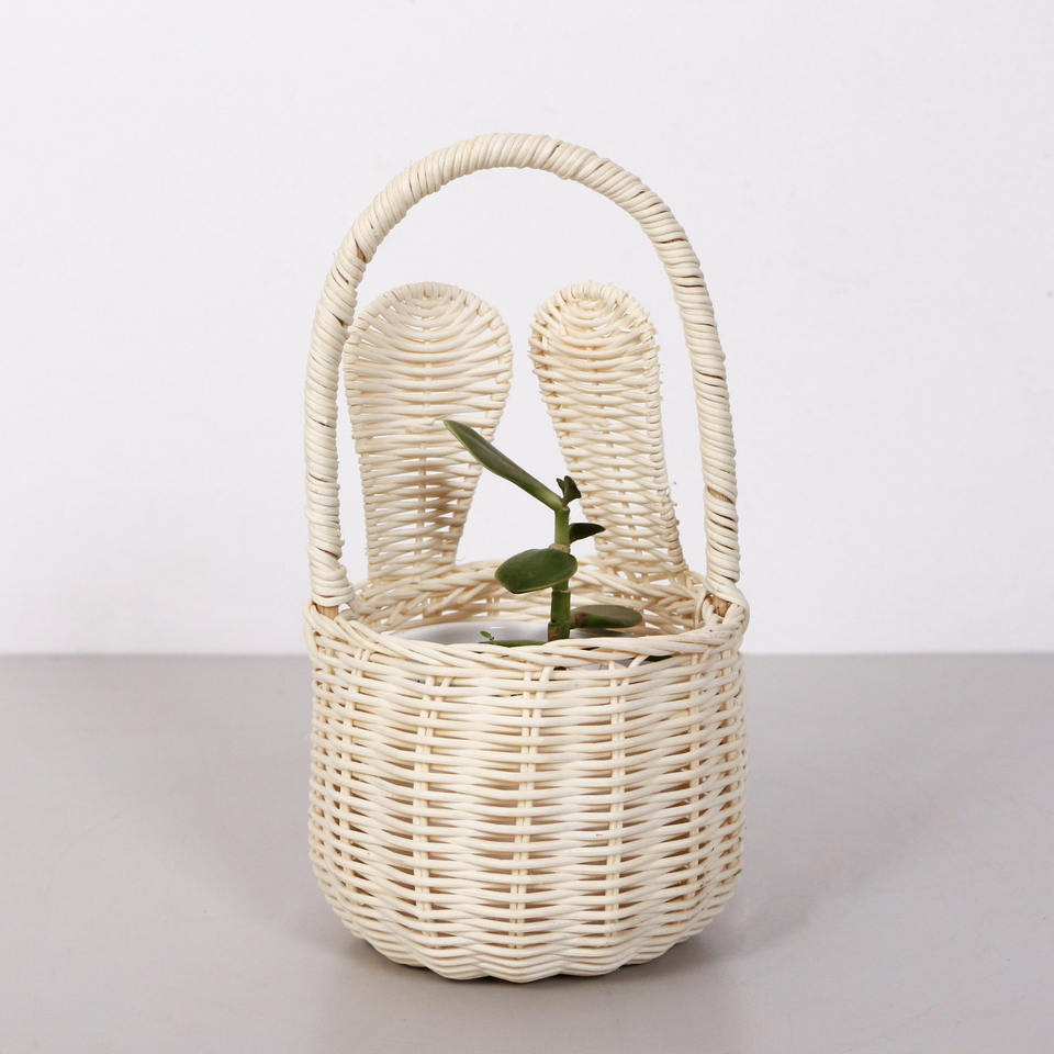 Cesta de mimbre de Pascua con forma de conejo, contenedor de ratán para regalos y flores.