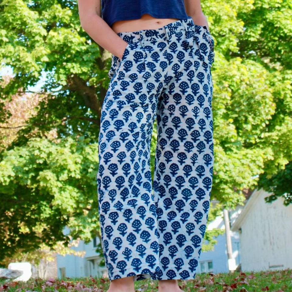Pantalones acampanados estampados con bloque de mano de pierna ancha algodón transpirable ODM estilo informal Mughal diseño Floral Natural Indigo comodidad de verano