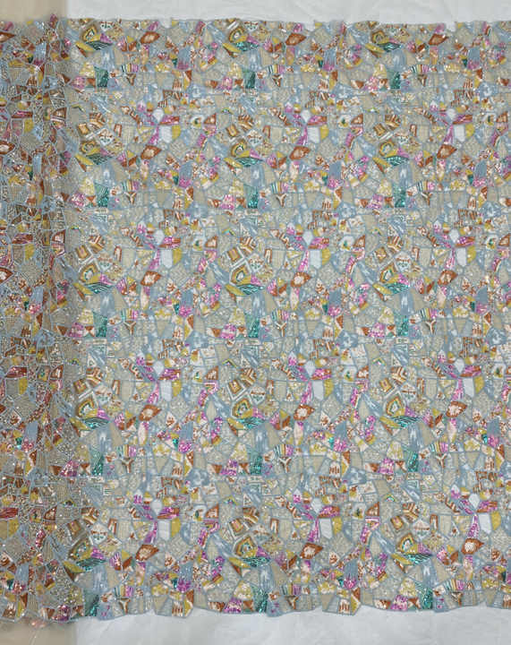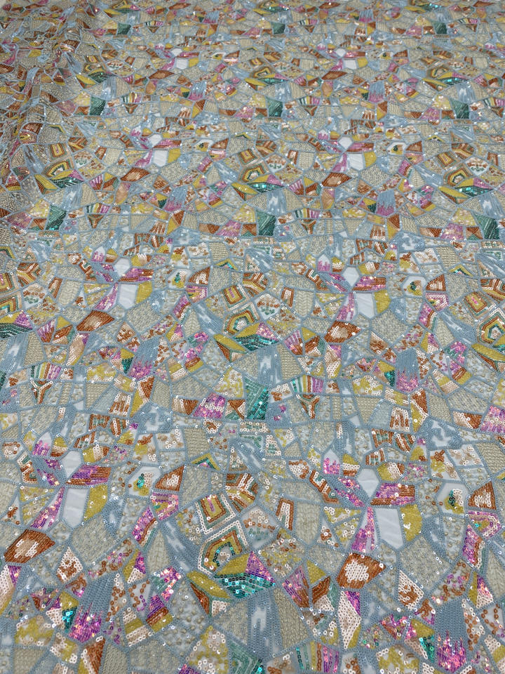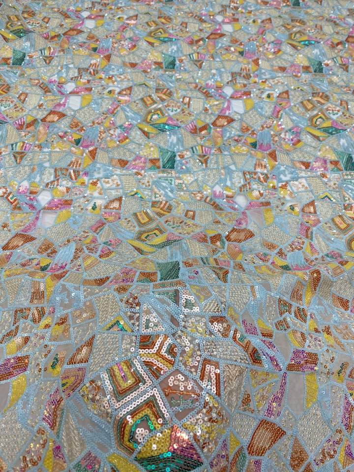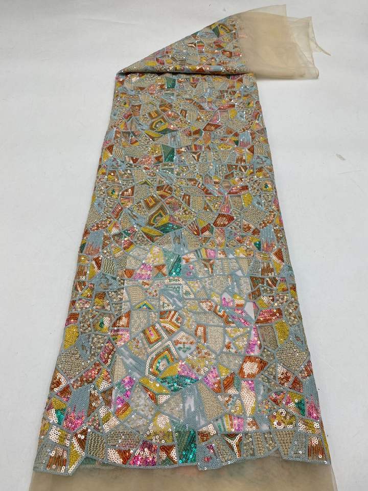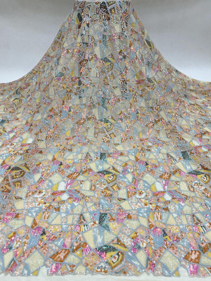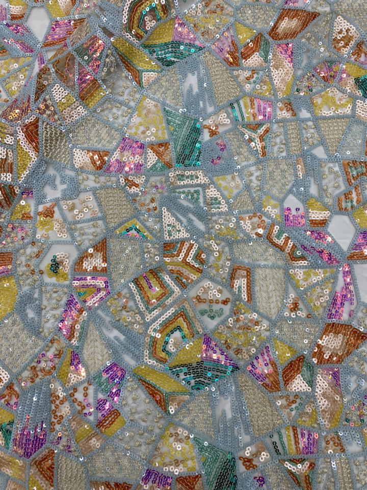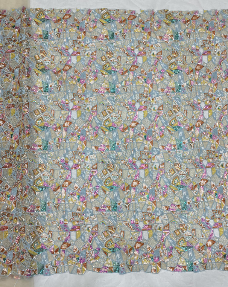 Ancho 130 cm Poliéster Lentejuelas coloridas Bordado geométrico Tela de malla Tela de encaje de tul pesado para vestido de novia Cheongsam
