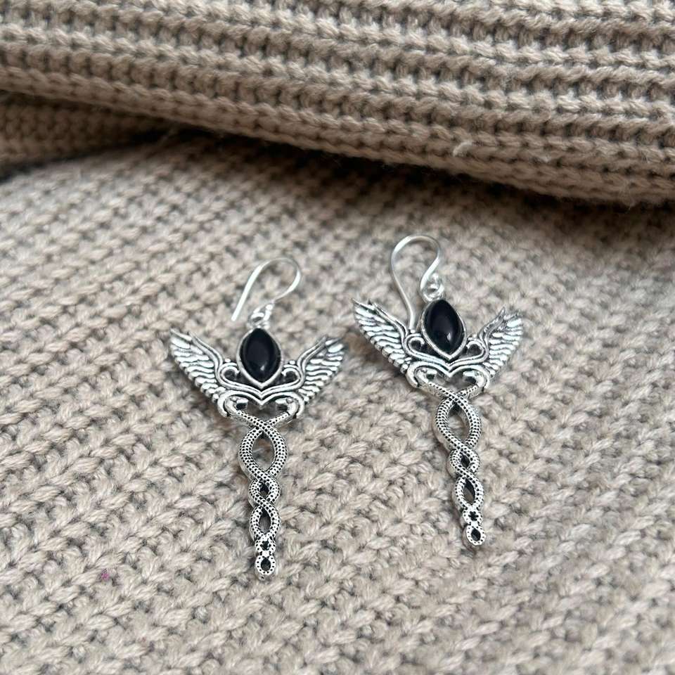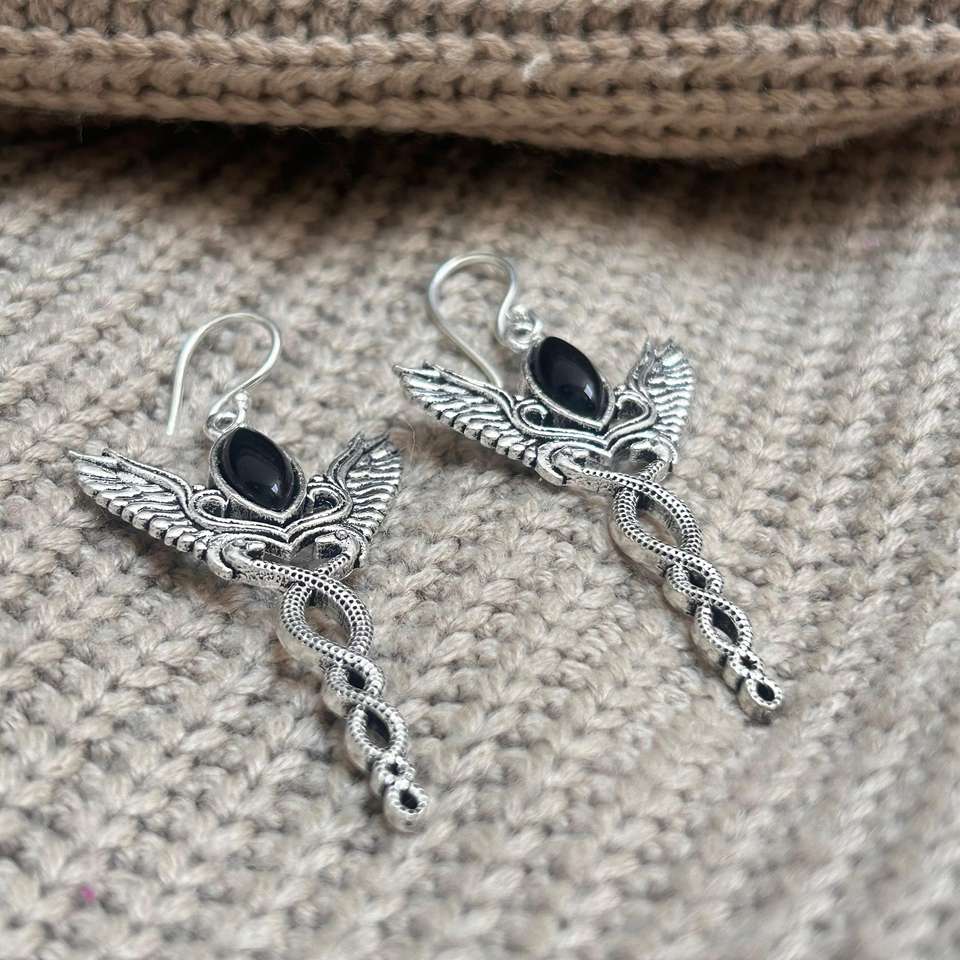 Pendientes Colgantes de Serpiente Alada Estilo Neo-Gótico, Ónix Negro, Latón Plateado, Regalo para Mujer, Venta al Por Mayor